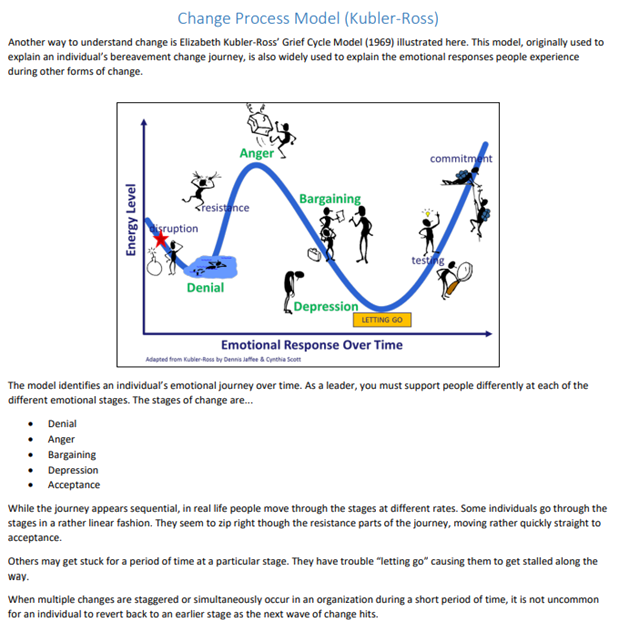 Change is situational. It is a disruption of expectations (e.g. new worksite, manager, roles, policy, processes, technology, etc.). Every change, even the most longed for, requires leaving something behind and letting go.